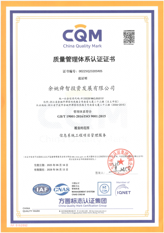 近日,余姚舜智投资发展公司在质量管理领域与技术创新领域均斩获佳绩,不仅顺利通过GB/T19001-2016/ISO9001:2015质量管理体系认证并取得证书,而且喜获5项计算机软件著作权登记证书,以“质量筑基 + 技术赋能”的组合拳,为数字化转型注入新动能。